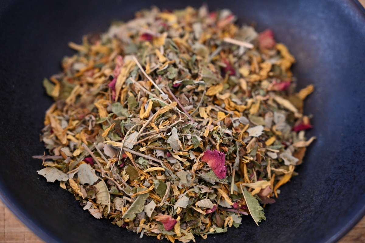 Brombeerblätter, Sonnenblumenblüten, Rosenblütenblätter, Verbenenblätter, Fenchel, Anis, Aromen.